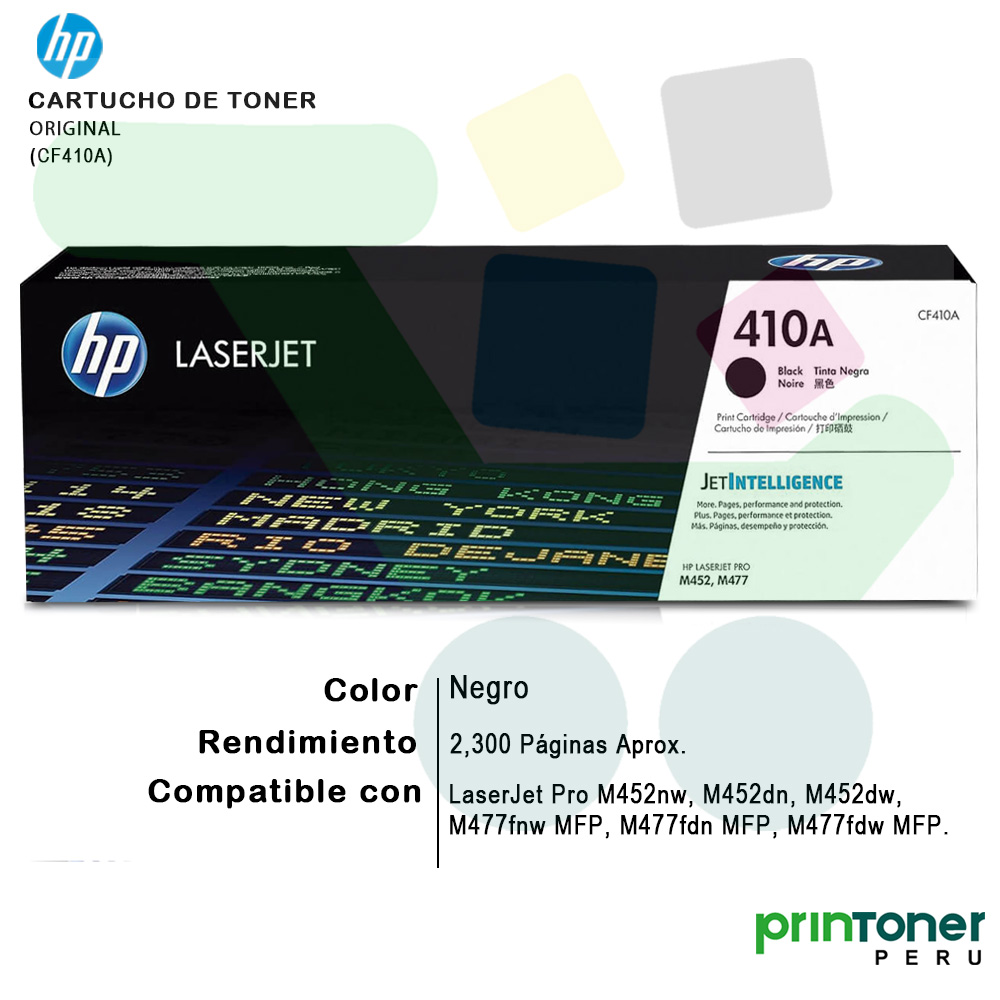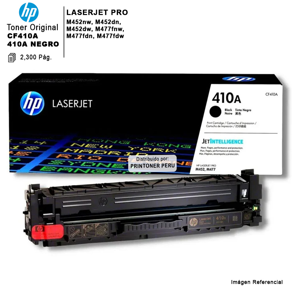 Tóner HP 410A Negro (CF410A) original, compatible con impresoras HP Color LaserJet Pro M452 y M477. Calidad profesional, alto rendimiento y confiabilidad HP garantizada.