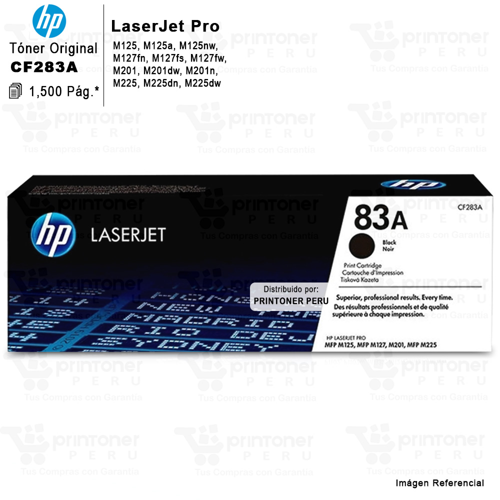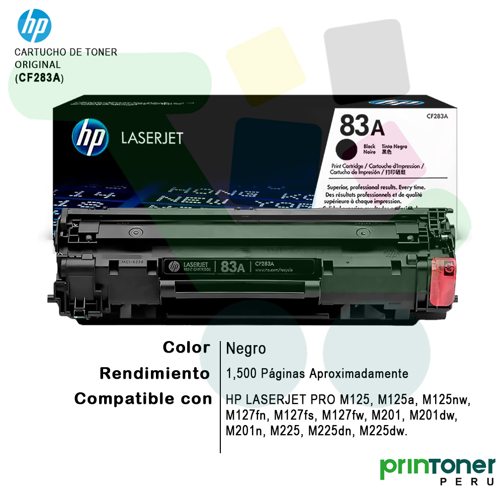 El Tóner HP 83A Original (CF283A) ofrece impresiones láser nítidas, confiables y de calidad profesional. Diseñado específicamente para impresoras HP LaserJet Pro, garantiza un rendimiento constante y una excelente definición de texto en cada página.